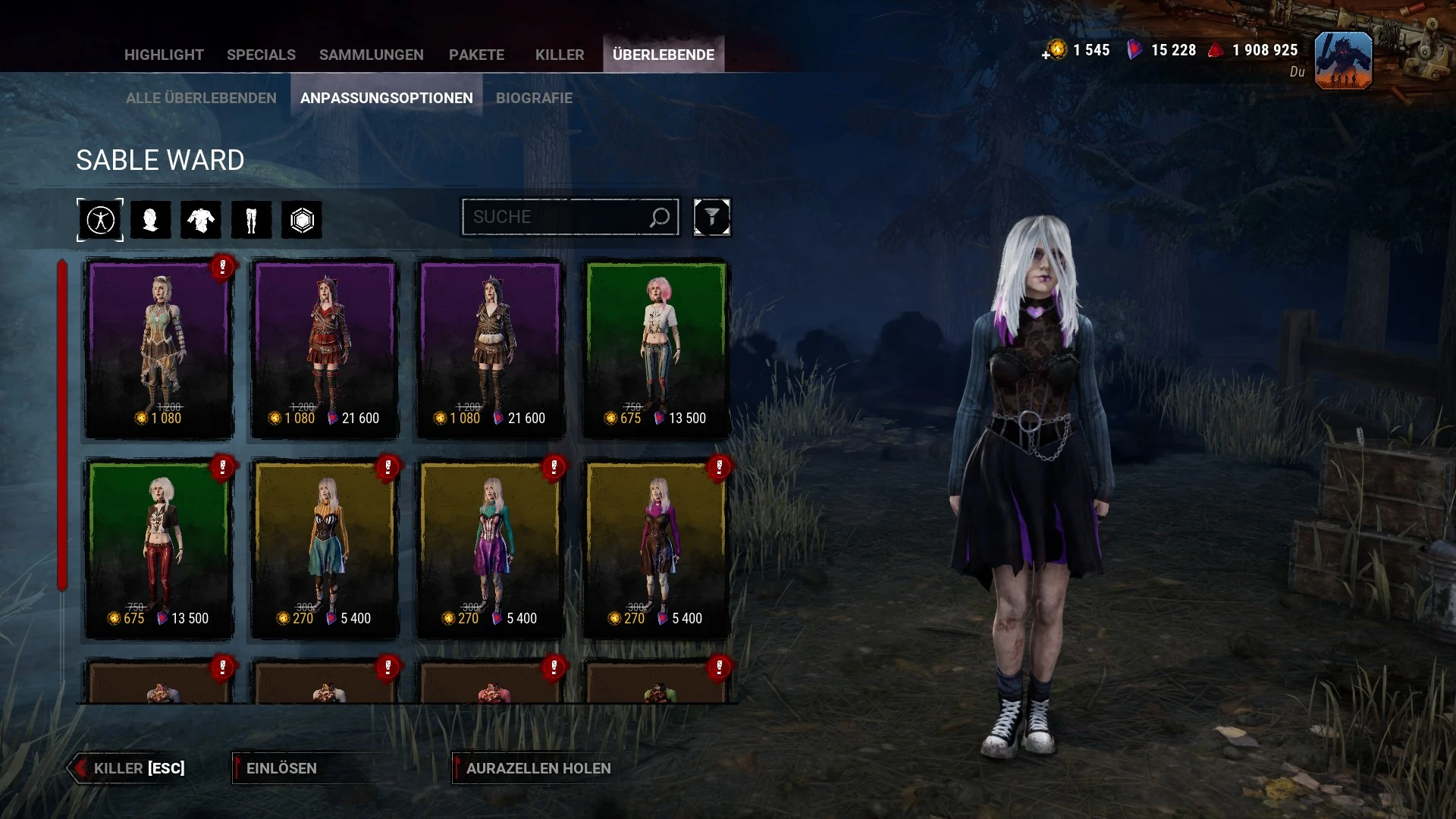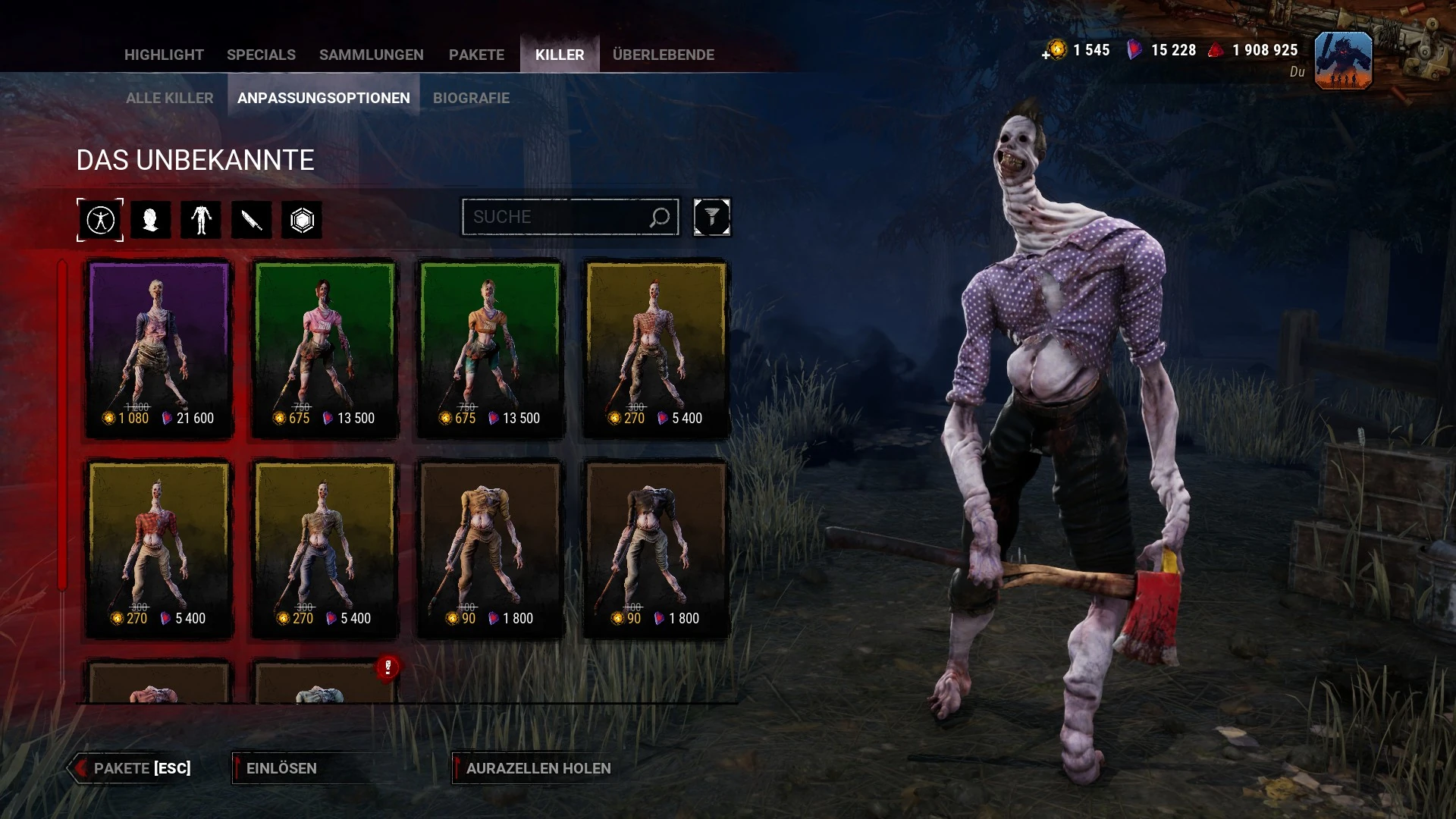 In dieser Kategorie werden alle derzeit verfügbaren Outfits für den ausgewählten Killer angezeigt, so dass die Spieler sie sowohl in der Vorschau ansehen und kaufen als auch mit anderen Outfits mischen können.
