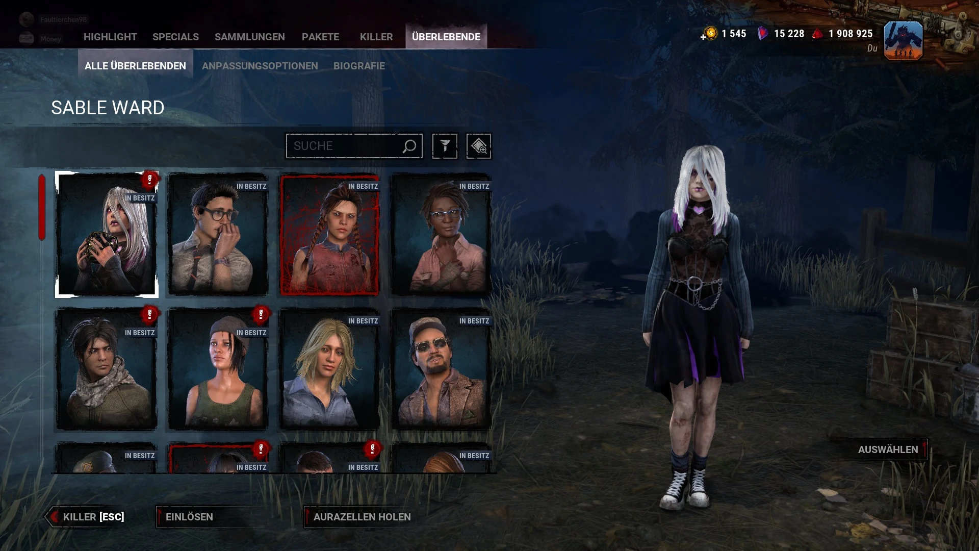 In dieser Kategorie werden alle derzeit verfügbaren Überlebende und ihre Outfits vorgestellt. Außerdem können die Spieler hier eine Vorschau ihrer Talente sehen.