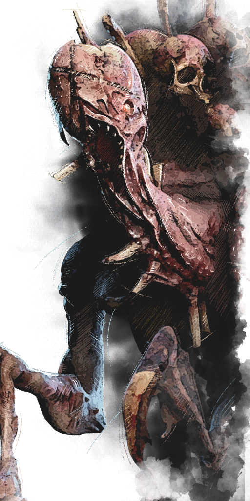 Cuando todo terminó, Otto sintió cómo el rechinante escenario de madera se sacudía mientras una bandada de cuervos volaba en círculos. De repente, el suelo se levantó y se hundió en un espeso y rezumante barro negro como la melaza. Momentos más tarde, una masa sin forma comenzó a chapotear fuera del lodo para luego levantarse como un caballo encabritado y alimentarse de la retorcida masa de humanidad masacrada.