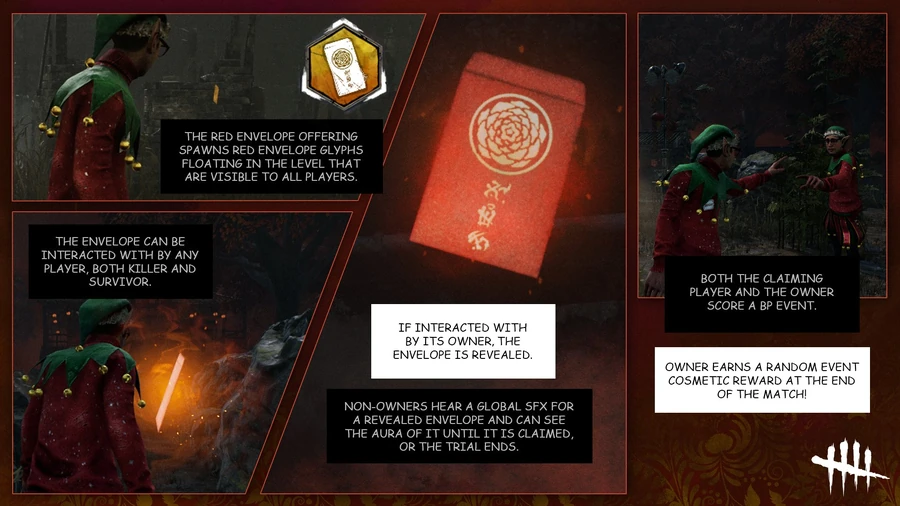 In addition to the additional bonus Bloodpoints awarded for interacting with the Red Envelopes, Players can open another Player's Red Envelope during the Trial; doing so will reward them with one of the 10 Event Cosmetic Rewards and grant the owner of the Red Envelope bonus Bloodpoints: